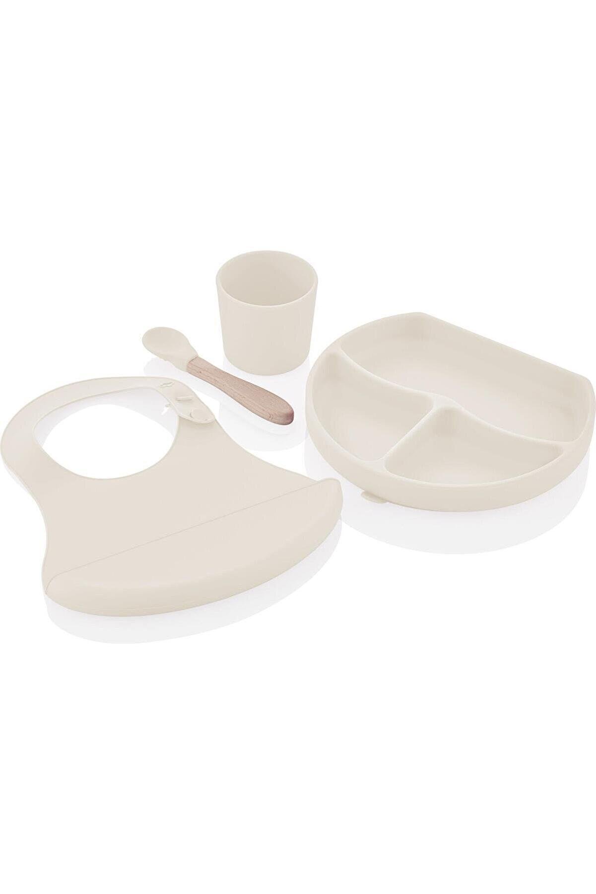 طقم طعام سيليكون من بيبي جيم موديل 72802 — مجموعة متكاملة باللون الاكرو تشمل لوح طعام، مريلة، كوب، وملعقة، مصممة من سيليكون آمن لتغذية الطفل بطريقة صحية وسهلة التنظيف.