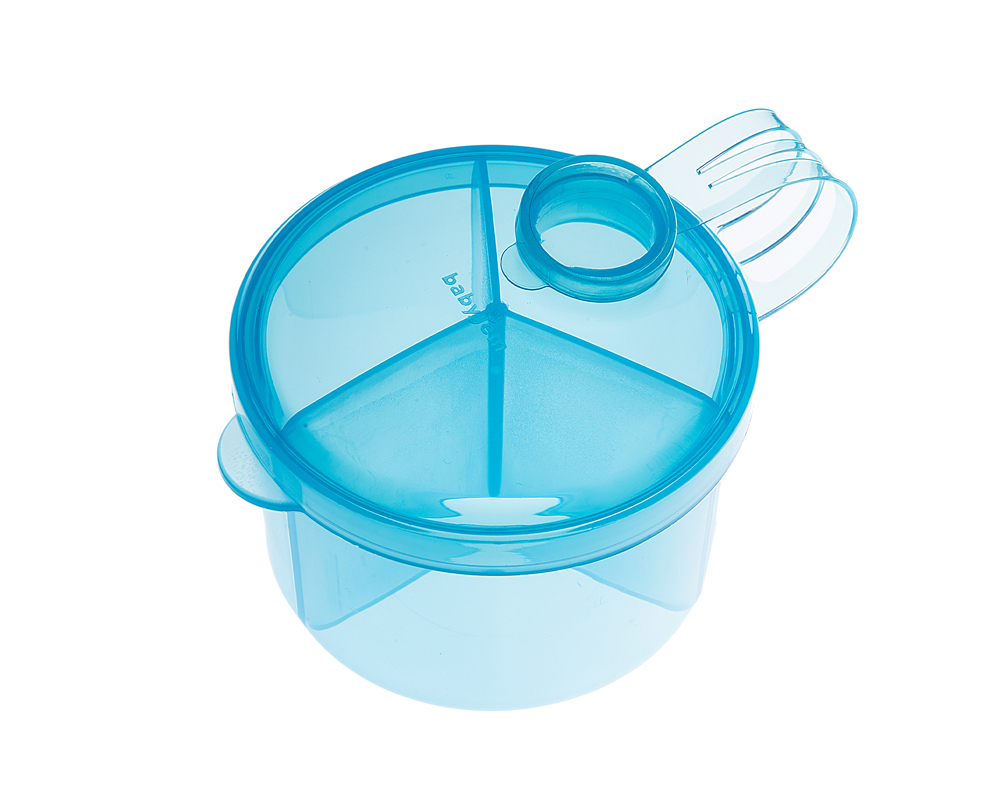 موزّع بودرة حليب بيبي جيم 3‑أقسام (49604) لون ازرق خالٍ من BPA، مناسب للتعقيم والغسيل وسهل الحمل لتجهيز وجبات الرضاعة بدقة.