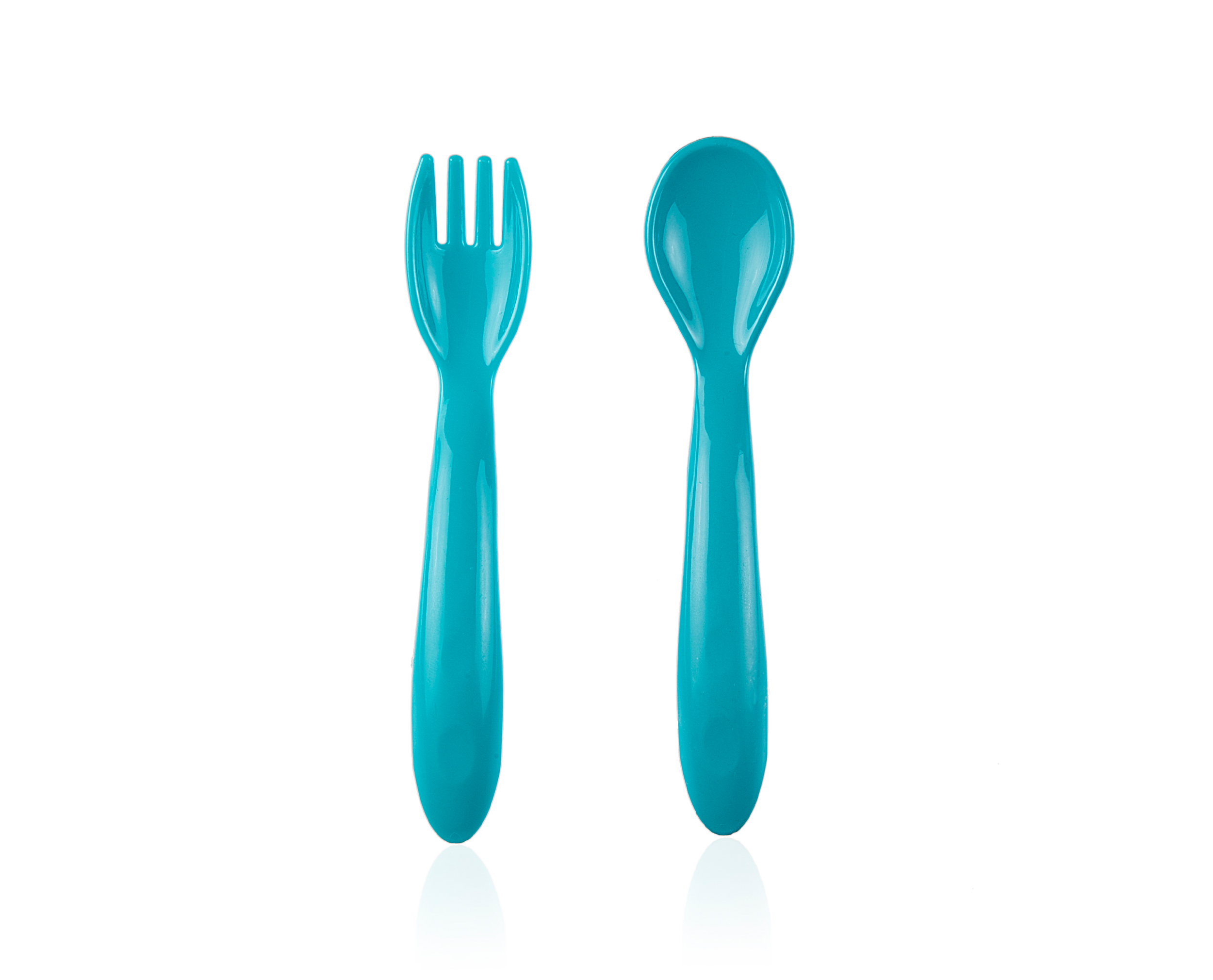 طقم ملعقة وشوكة من بيبي جيم – موديل 49502 (أزرق) — ملعقة وشوكة صغيرة مصمّمة خصيصًا لليد والفم الصغير للطفل، لتسهيل عملية التغذية وتشجيع الاستقلالية بطريقة آمنة ومريحة.