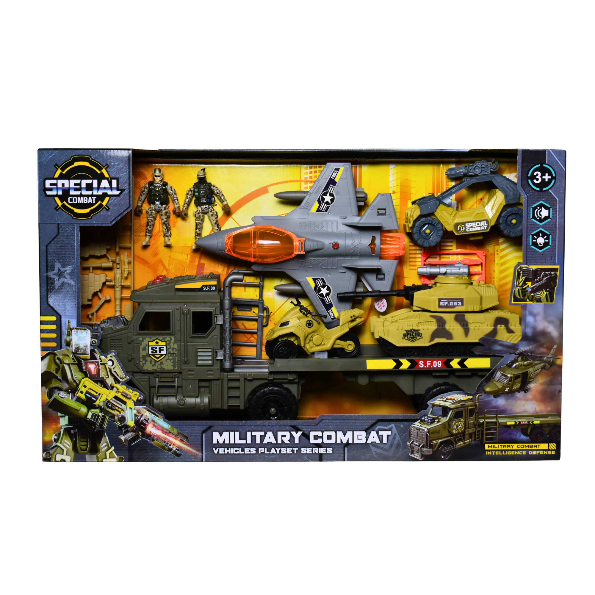 يشمل دبابة، دراجتين، طيارة، سيارة حاملة، وأسلحة الجيش لتجربة لعب متكاملة وممتعة.