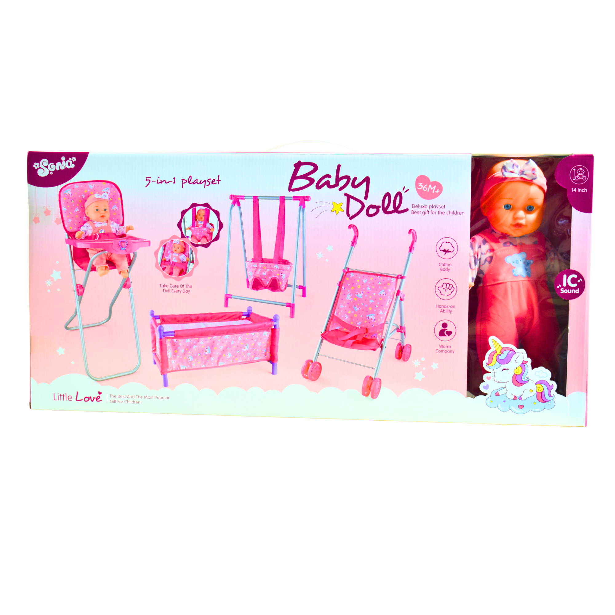 تشمل الطقم: دمية + عربة + سرير + أرجوحة.
