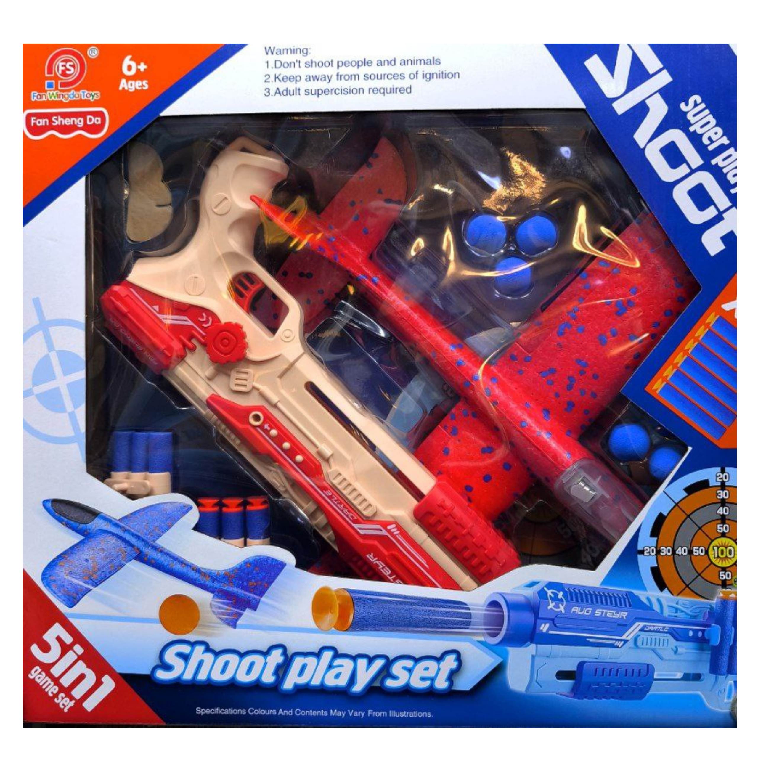 محتويات المجموعة: مسدس لعب + طلقات 5-in-1 + طائرة بإضاءة + هدف تصويب
